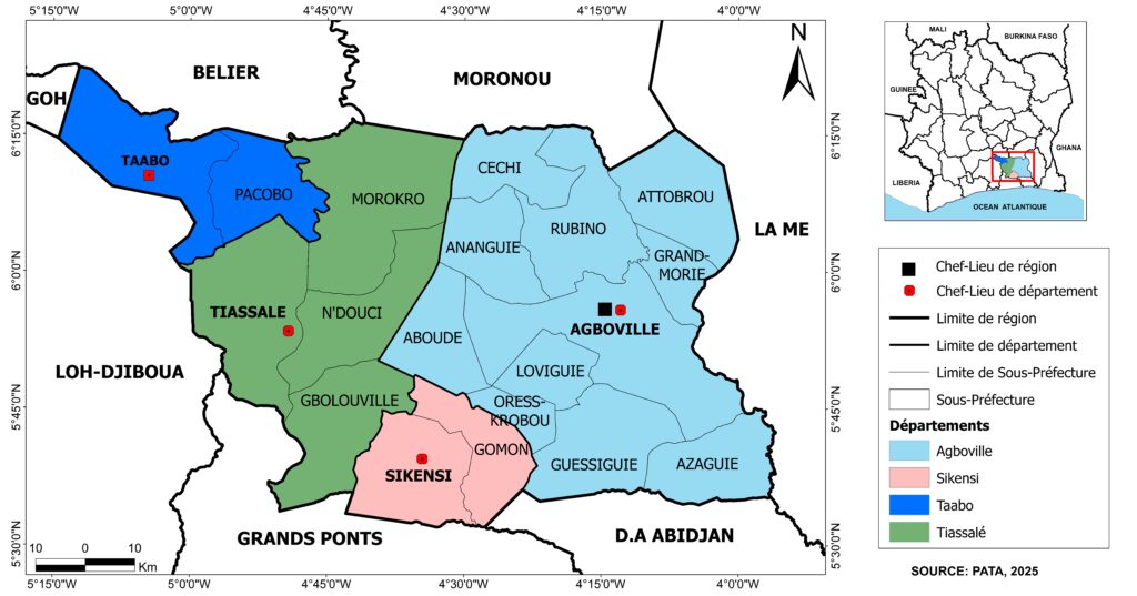 La région de l’Agnéby-Tiassa est l’une des 31 régions de la République de Côte d’Ivoire, située au sud du pays, dans le District autonome des Lagunes. Créée en 2011 lors du découpage administratif, elle se distingue par sa richesse naturelle, son dynamisme économique et son potentiel touristique. La région est bordée au nord par la région du Bélier, à l’est par celle de la Mé, au sud par l’Atlantique, et à l’ouest par les régions du Gôh et du Loh-Djiboua. La région compte 198 villages et 07 communes à savoir Agboville, Azaguié, Rubino, Tiassalé, Sikensi, N’Douci et Taabo. Elle compte quatre départements a savoir : Agboville, Tiassalé, Sikensi et Taabo. Son chef-lieu est Agboville. Le conseil régional de l’Agneby-Tiassa est présidé par le Ministre Monsieur Pierre N’GOU DIMBA.